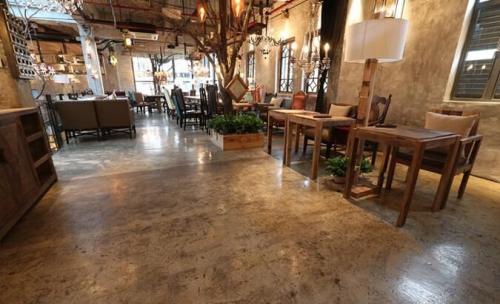 施麥貝復古地坪的獨特之處就在于作用一定的工藝將地面做出懷舊的滄桑感,水泥的自流平技術更是將整個效果呈現一種渾然天成的感覺,營造出一種自然古樸的內涵美。