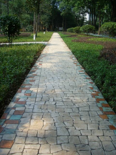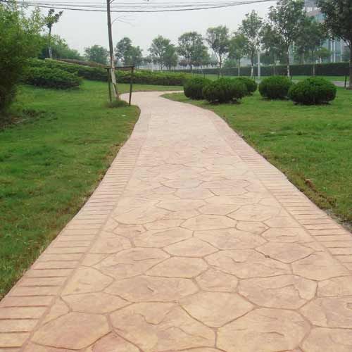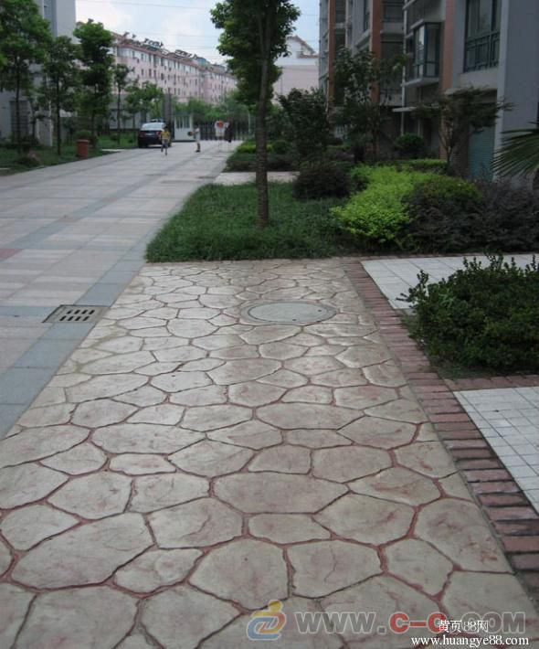 壓模前要事先研究并制訂成型模排列及提放的位置及方向,確保圖案的整體性。將第一塊成型模沿著放樣圖案參照線鋪設,并將其垂直壓進混凝土內。施工者可以站立在成型模上,人體自身重量足以使成型模能在混凝土表層形成紋理,必要時可以使用明建成型模專用搗棒把成型模垂直地壓進施工面內,以更好地壓出清楚逼真的圖案。掌握壓模的時間非常重要,太濕或太干的混凝土表面都會影響最后的圖案及效。